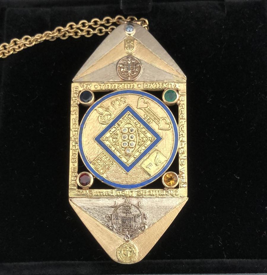 El talismán está realizado enteramente en oro amarillo y blanco, con solo 4 piedras (diamante, rubí, esmeralda, topacio amarillo y zafiro azul) y esmalte azul cobalto.