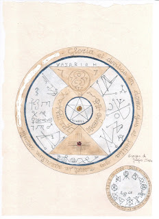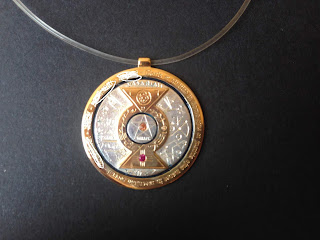 Tiene un diminuto topacio amarillo y un pequeño granate en el centro de la rueda de la medicina.