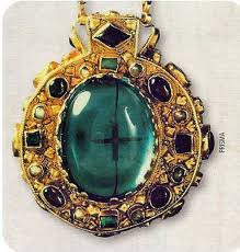 Un colgante deslumbrante, datable del siglo IX, en filigrana de oro con, en el centro, en la parte anterior, un zafiro ovalado, cortado en cabujón, del cual vemos, en transparencia, una reliquia. Alrededor y en ambas caras,engarzadas en oro, trabajado con filigrana y granulación, hay hasta cincuenta y tres piedras preciosas montadas de acuerdo con su forma y su color, entre las cuales podemos reconocer perlas, granates, amatistas y esmeraldas.